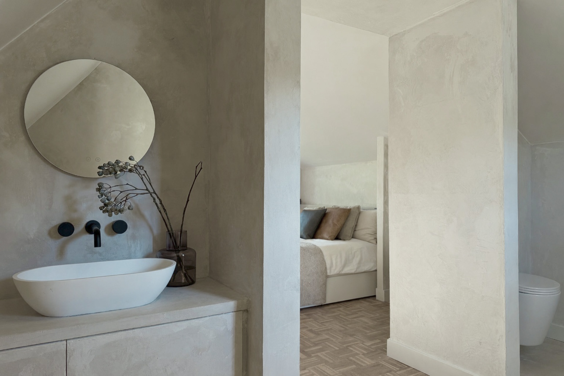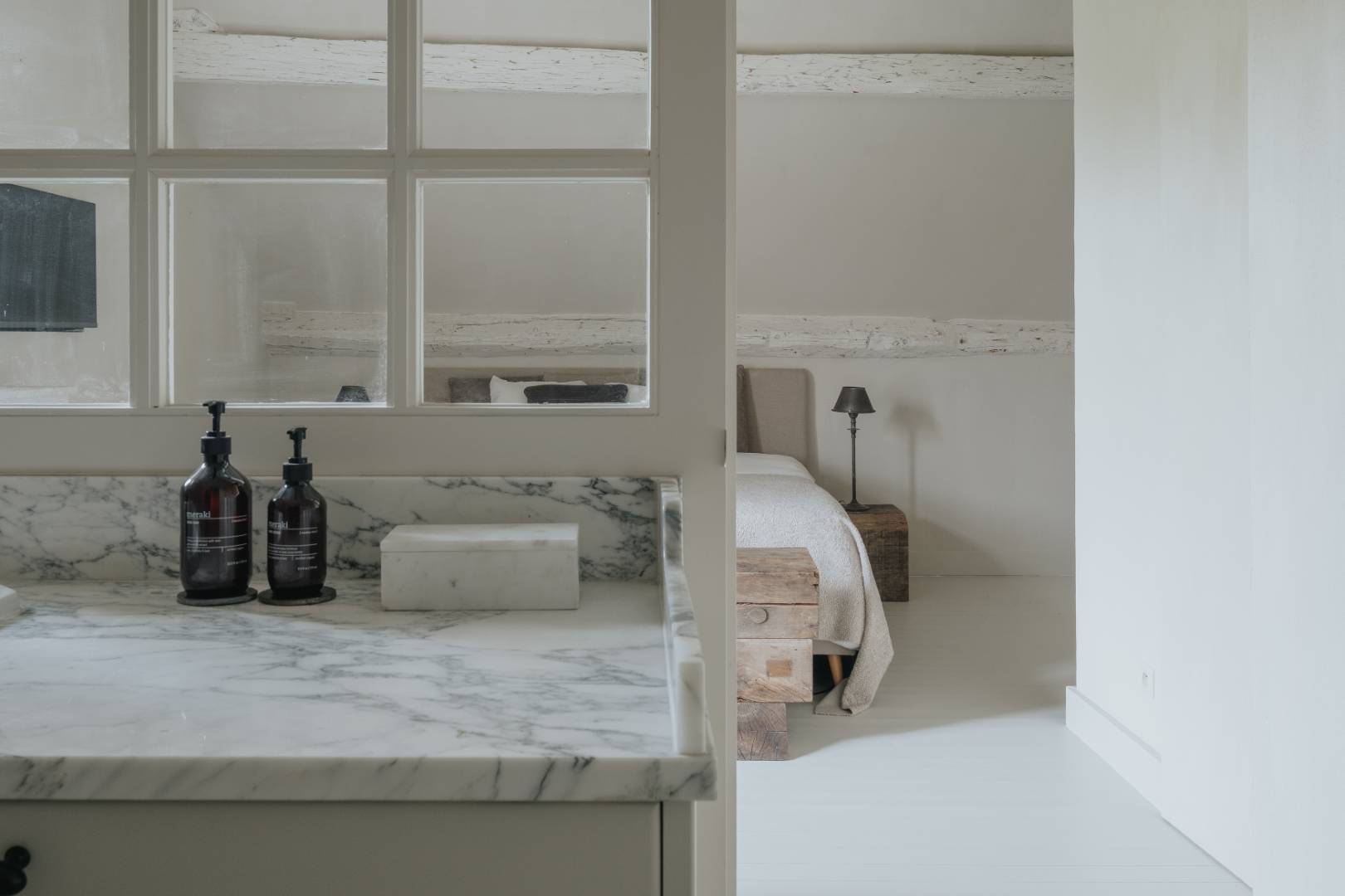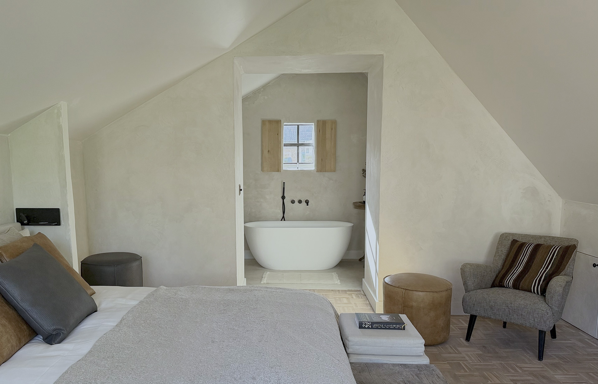 Eyecatcher van de kamer is het vrijstaande bad, discreet geïntegreerd in de ruimte — perfect om de avond rustig af te sluiten of de ochtend traag te laten beginnen. Alles is hier gericht op genieten zonder haast, in een setting die warm en authentiek aanvoelt.